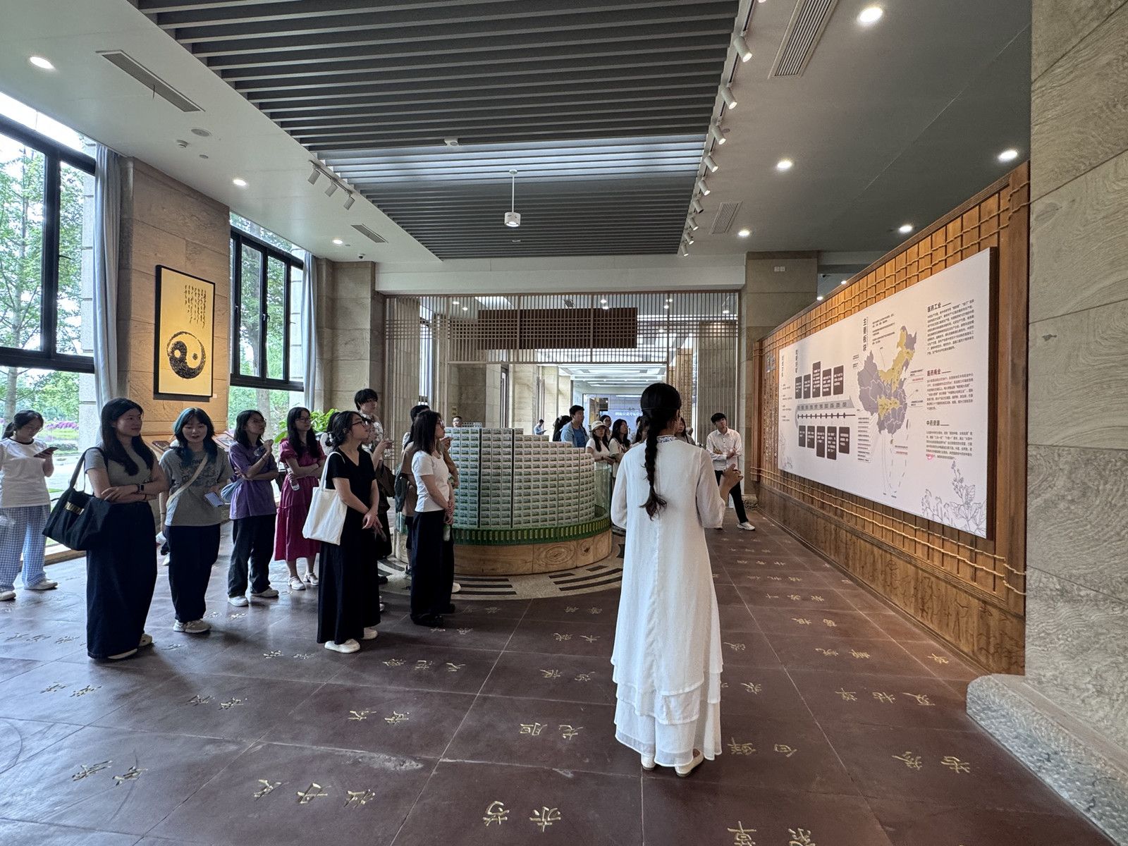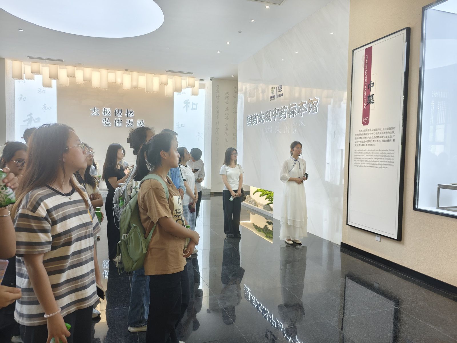 接着,同学们走进国药太极品牌文化馆。讲解员生动的讲述勾勒出太极集团从创立之初的艰苦创业,到如今发展成为行业领军企业的成长轨迹。丰富的图文资料、实物展品与多媒体展示,全方位呈现了太极集团在医药工业、商业及大健康产业的全产业链布局,让同学们深切感受到企业“做强做优做大医药健康主业”的坚定决心与使命担当。