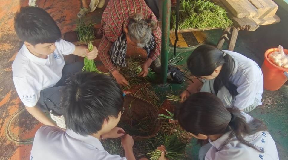 3 实践团成员在“渝忠客2180”渡轮上帮助菜农择菜